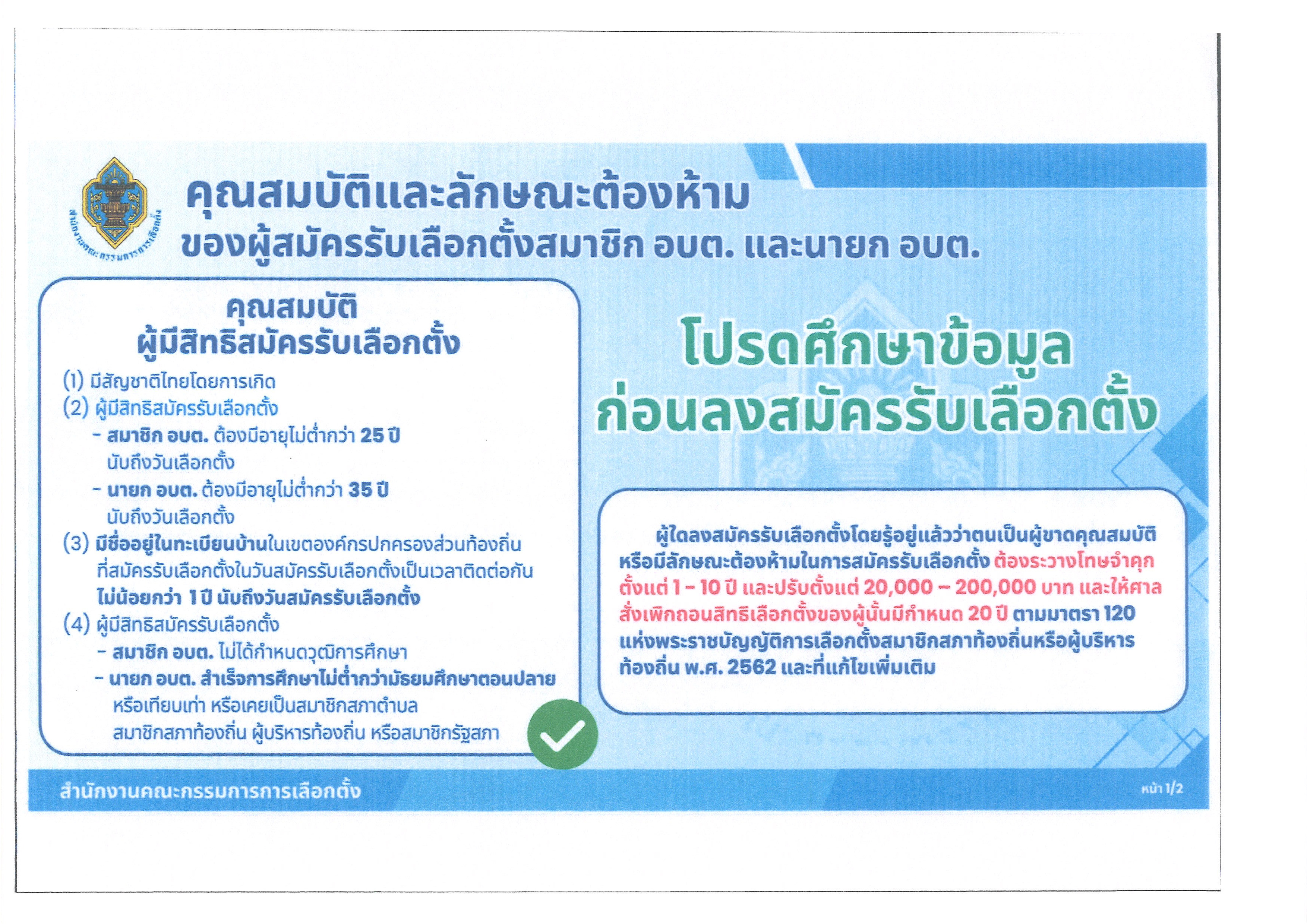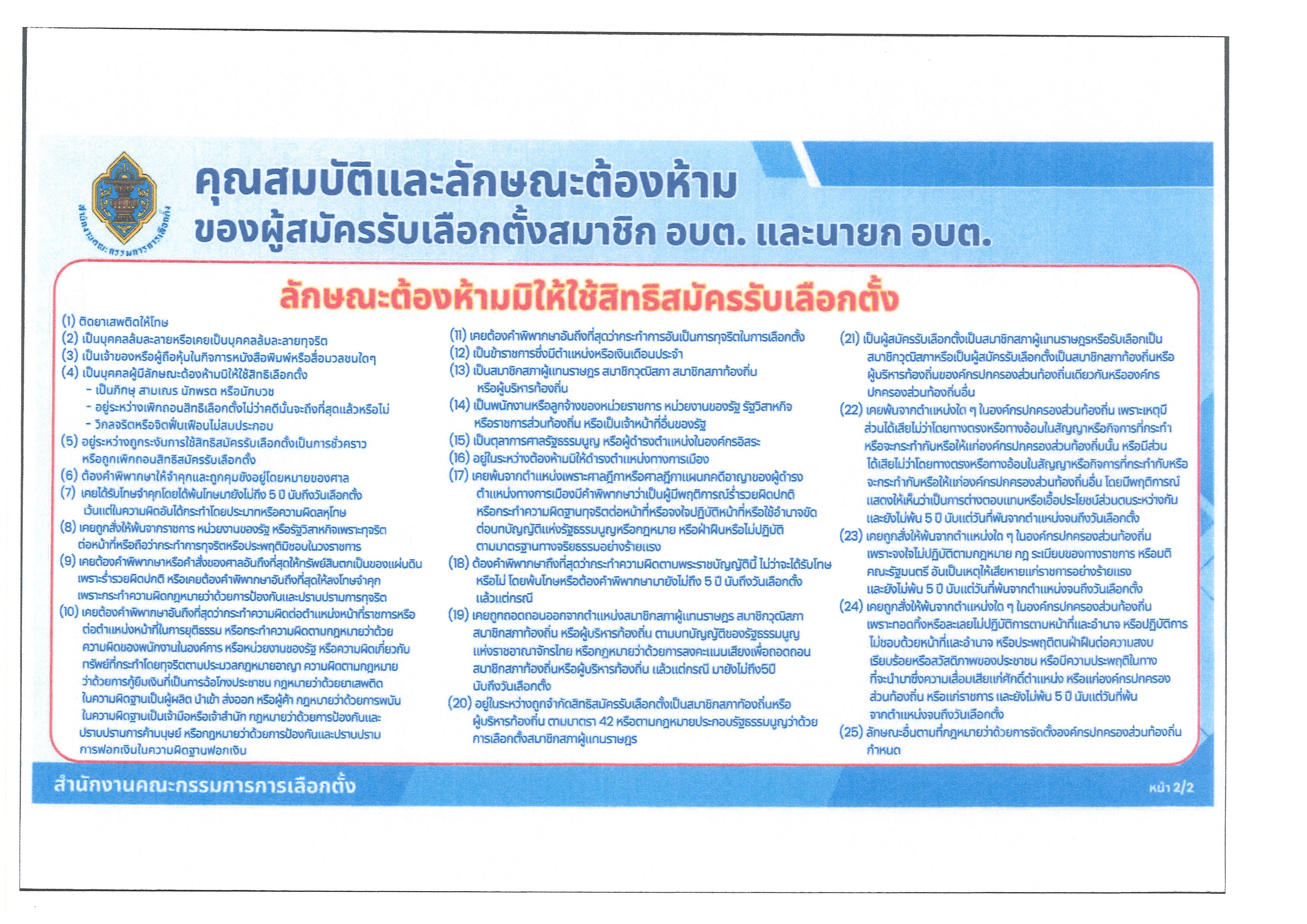 ประกาศจากองค์การบริหารส่วนตำบลทุ่งสมอ เรื่อง คุณสมบัติและลักษณะต้องห้ามของผู้สมัครรับเลือกตั้งสมาชิก อบต.และนายก อบต.